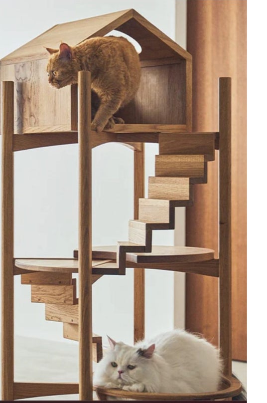 「大切な家族の猫のために」インテリアにも馴染むこだわりのキャットツリーハウスがで きました。 猫にとっても心地よく、飼い主にとっても見るだけで気分が上がる美しいデザ イン。耐久性‧希少性も高く、美しい木目のナラ材を使用しており、高い技術を持つ職人 が一つ一つ手作業で丁寧に仕上げています。