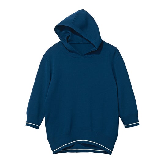 パーカーとパンツのコーディネート(ブラック)雨の日もアクティブに過ごせるヘルシー美人のためのニットセットアップもご用意しました。さらっと気持ちのいいニット素材にはっ水機能を加えたこちらのアイテムは、身体のラインを拾いにくい構築的なフォルムと軽さが特徴です。かぶり型のパーカーには立体的なフード、7分袖、ドロップショルダーの軽快なデザインが施され、リブ編みの配色ラインが爽やかな印象を添えます。パンツは脚長に見えるセンタータック。高さのある靴にも合うよう、裾にベント(切れ込み)を設けています。さらに、美脚効果を高めるサイドラインも特徴となっております。