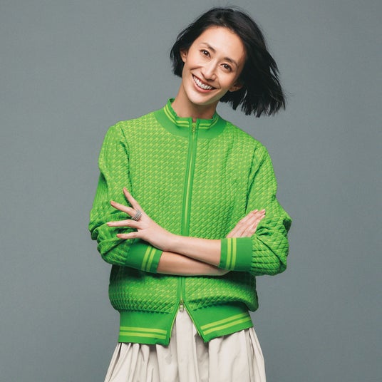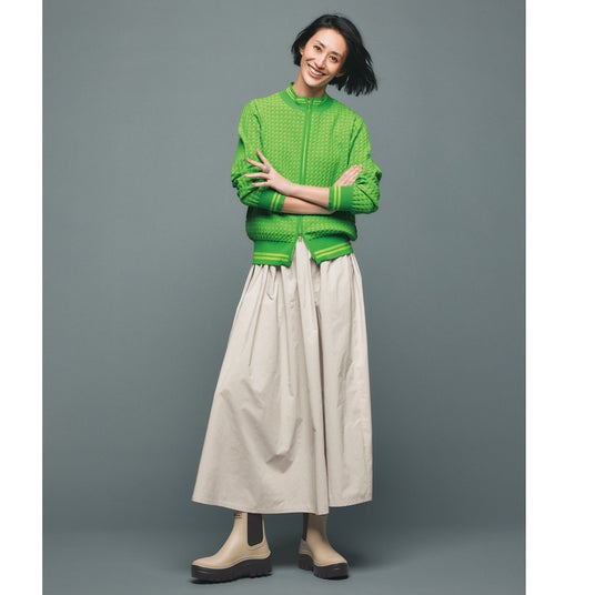 「はっ水ジャカードニットジップブルゾン」と「アーティローザはっ水タフタフレアスカート」のコーディネート梅雨こそ、色のパワーでポジティブに!ドライタッチのはっ水糸で編んだコンパクトなジップブルゾン。凹凸のあるジャカード編みが繊細な影を生み、鮮やかなライムカラーに品のいい深みを与えます。両開きファスナーが程よい抜け感を作るのも、洗練された印象を与えます。