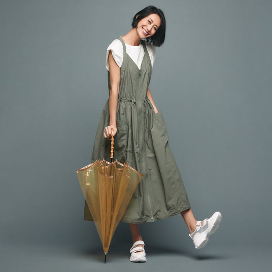 軽量で可愛らしい快適なジャンパースカートは、すとんと纏えば今っぽく決まる一品です。はっ水素材でありながら、晴れの日も快適に着ることができます。軽やかなドレープとマットな光沢を備えたデザインは、大人っぽさを引き立てます。ウエストと裾まわりのドローコードにより、フィット&フレアやバルーンシルエットなど自在なスタイリングが可能です。さらに、逆開ファスナーの裾側を開けばパンツとのコーディネートも楽しめます。