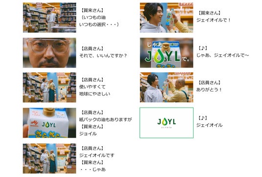 スーパーマーケットの食用油売り場で、「いつもの油、いつもの選択」と言いながら何気なく食用油を選び手に取る賀来さん。そこに突如現れた店員さんから「使いやすく地球にやさしい紙パックの油もありますが」と便利で地球にやさしい紙パックの食用油「スマートグリーンパック(R)」シリーズを、強烈に薦められる賀来さん。差し出された商品パッケージのJOYLロゴを「ジョイル」と読み間違え、店員さんに「ジェイオイルです」と訂正された賀来さんは、納得した感じで「じゃあ、JOYLで。」と嬉しそうに「スマートグリーンパック(R)」シリーズを選びます。それに対して店員さんが「スマートグリーンパック(R)」シリーズの容器が話しているようなコミカルな仕草で、賀来さんに選んでくれてありがとうと伝えます。