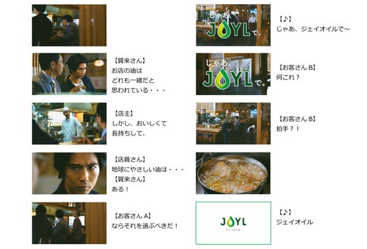 一人とんかつ屋でとんかつ定食を美味しそうに食べているお客さん。横に座っていた賀来さんが突然お客さんにむかって「お店の油はどれも一緒だと思われている・・・」と問いかけると、とんかつ屋の店主と店員さんがお客さんへ「しかし、美味しくて、長持ちして、地球にやさしい油は・・・」と続き、賀来さんが「ある!」と力強く断言。すると、他のお客さんが席を立ち上がり「ならそれを選ぶべきだ!」と言った次の瞬間、賀来さんも席から立ち上がり、とんかつ定食を食べていたお客さん以外の全員で「じゃあ、JOYLで。」と熱唱します。それを見たお客さんは周りを見ながら「何これ?」と言い、拍手(と思いきやお店で揚げているとんかつがパチパチと揚がる音だった!)で締めくくられます。