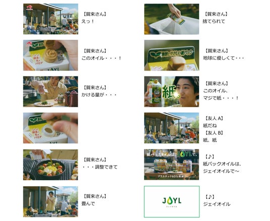 自宅の庭で友人達とバーベキューを楽しむ賀来さん。料理の仕上げに「スマートグリーンパック(R)」シリーズのオリーブオイルを手に取った瞬間、カルパッチョには細く・アヒージョには多く注げる使い分けができるキャップに気づき興奮が高まります。加えて使い終わった後はコンパクトに畳んで捨てられ、地球にやさしい(プラスチック60%削減※)紙パックを「このオイル、マジで紙!」(「紙」と「神」をかけています)と評します。周囲の友人たちから冷静に「紙だね」と突っ込まれながら、「紙パックオイルは、JOYLで。」と締めくくり、楽しいバーベキューは続きます。