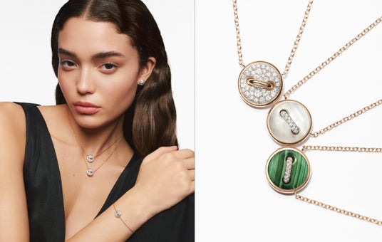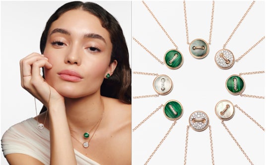 誕生したのは3つのバリエーションです。1つ目はグリーンマラカイト、反対側にはマザーオブパールをあしらっています。2つ目は煌めくダイヤモンド、反対側にはマザーオブパールを採用しています。3つ目は片面がグレー、もう片面がホワイトのマザーオブパールです。ペンダントやブレスレットは、このディスクを裏返すことで、その日のカラーを決めることができます。
