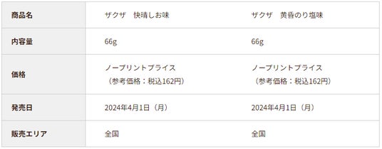三幸製菓株式会社は、こだわりを詰め込んだお米のクラフトチップス「66g ザクザ 快晴しお味」と「66g ザクザ 黄昏のり塩味」の2品を2024年4月1日(月)から全国で発売いたします。