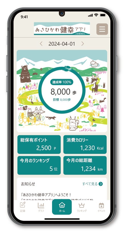 また、アプリのアイコンやイラストは旭川市在住のイラストレーター「ナカジマヨシカ」さんに制作を依頼。バーチャルウォーキング機能では旭川市内の野外彫刻巡りや、あさひやま動物園を一周できるコースを実装し、旭川らしさを感じられるアプリとなっています。