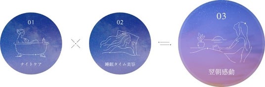 健やかな朝を迎えるため、夜間に行う美容習慣を「夜間美容(ナイトケアビューティー)」と定義しました。家に帰ってから寝る前までの間の「ナイトケア」と、寝ている間の夜間の「睡眠タイム美容」で「翌朝感動」の仕上がりを提供します。01 寝る前の補修*2・保湿「ナイトケア」