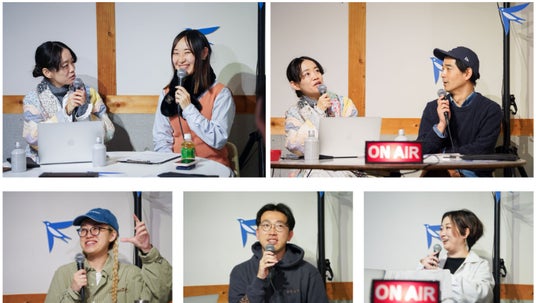 freeeラジオの様子(上段左から、古性のちさん(写真家・エッセイスト)/中村秀一さん(書店「Snow Shoveling」店主)/福永紋那さん(書店「OH! MY BOOKS」店主)/武田俊さん(メディアリサーチャー / 編集者、法政大学文学日本文学科兼任講師)/市原えつこさん(アーティスト、妄想インベンター))