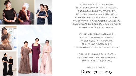 新郎新婦の母親のためのレンタルマザードレスサロン株式会社ファンタドレス(本社:東京都江東区、代表:大塚いづみ)は、2024年4月1日(月)より、新サイト「Dress your way」をローンチしました。
