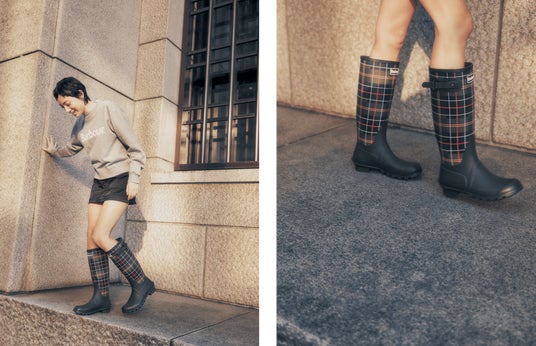 ワックスジャケットの裏地でお馴染みのバブアータータンを大胆にあしらったレインブーツや、