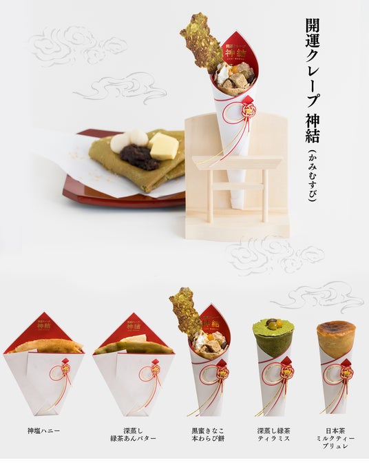 パリパリ/もちもち生地、また米粉/緑茶味 の4種類からなる日本を感じさせる見た目と味の、こだわり抜いた和クレープ。