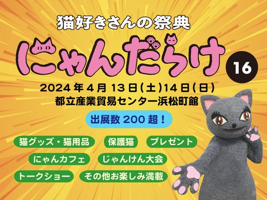 16回目を迎える猫好きさんの祭典「にゃんだらけ」が、4月13日(土)14日(日)東京都立産業貿易センター浜松町館で開催されます。毎回、趣向を凝らした場内企画と多彩なプレゼントで猫好きさんに喜んでいただいているにゃんだらけ。今回も盛りだくさんです。