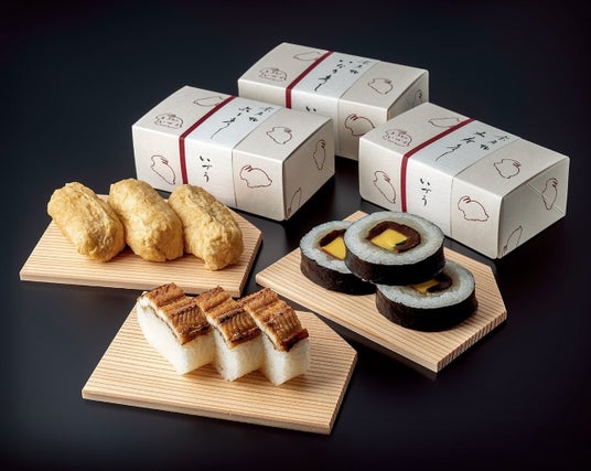 左:小箱 京いなり 1,134 円(3 個) 中央:小箱 焼⽳子 1,458 円(3 貫) 右:小箱 太巻き 1,458 円(3 貫)/その他の商品 鯖姿寿司 2,970 円(1人前5貫)