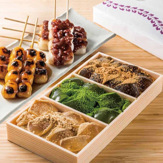 小豆たっぷりの「ぜんざい」と、焼きが香ばしい秘伝のタレの「みたらし」のだんごを計 10 本詰め合わせ。本わらび粉を使用した、なめらかで優しい口溶けのわらび餅は、国産大豆の「⽪むききな粉」と「宇治抹茶」「波照間の⿊糖」の 3 ⾊セットです。