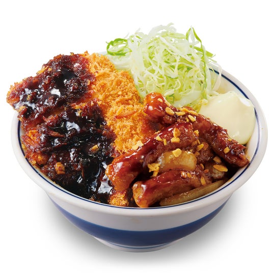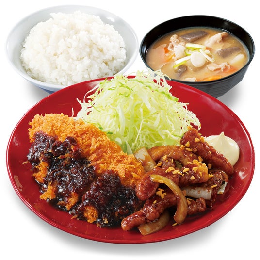 濃厚なニンニク醤油のソースが絡むスティック状にカットした豚ロース肉は、食べやすさだけでなく、食べごたえも忘れません。合い盛りにしたチキンカツで、ボリューム感はもちろん、コクがありクリーミーなマヨネーズを添えた味の変化も楽しめる一品です。