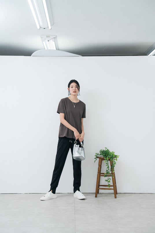 高身長女性泣かせのアイテム、ジョガーパンツ。レディースでは丈が足りず裾がふくらはぎに…というのは容易に想像が付きます。とはいえ、メンズのジョガーパンツではカジュアルすぎる。そんな高身長女性の悩みをATEYAKAが解決します。