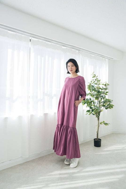 きちんと足首まで着丈のあるマキシ丈ワンピースは、1枚でコーデが完成し、スタイルアップも実現する万能アイテムになっています。高身長女性はマキシ丈のワンピースになかなか出会えない中、このアイテムによって「毎日の朝の着替えの時間を楽しくポジティブに」、そして「一瞬で終わるものに」して欲しいというディレクター大倉の想いが込められています。首が詰まっておらず、肩幅も窮屈さがないので、着ていてストレスフリーなだけではなく、袖が短すぎない、袖口幅が足りないということもありません。二の腕の途中に袖口が引っかかるストレスも無縁です。