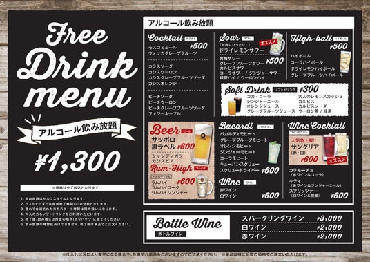 +1300円(税込)でアルコール飲み放題(平日4時間!、土日祝3時間!)も追加可能。