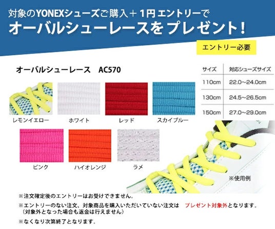対象のヨネックステニスシューズ・バドミントンシューズを購入してエントリーすると、ヨネックスオーバルシューレース(AC570)がもれなくもらえるキャンペーンとなります。