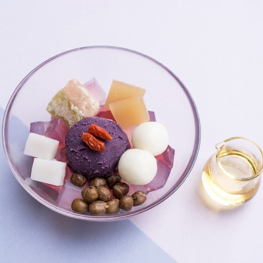葡萄寒天と綾紫芋餡を使用し、藤色のあんみつに仕上げました。見た目も華やかでおうちでも藤の雰囲気を感じられる一品です。さっぱりとした白蜜をかけ、素材の味をお楽しみいただけます。