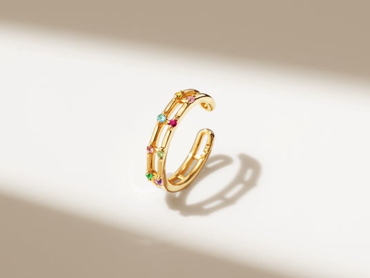 今回、「エマドット」コレクションには、新たにリング3種(内1種は店舗限定)・イヤーカフ1種・ブレスレット1種が加わります。「マルチカラージュエル K18/K10リング・エマドットL」は、繊細なラインはそのままに、ボリューム感ある約8mmのリング幅と、約1.5mmの宝石を24石使用した贅沢な作りが特徴。「マルチカラージュエル K18/K10リング・エマドットS」は、日常への取り入れやすさ、コーディネートのし易さを主軸に、繊細なラインを約1mmの12石の宝石で彩ったアイテムです。