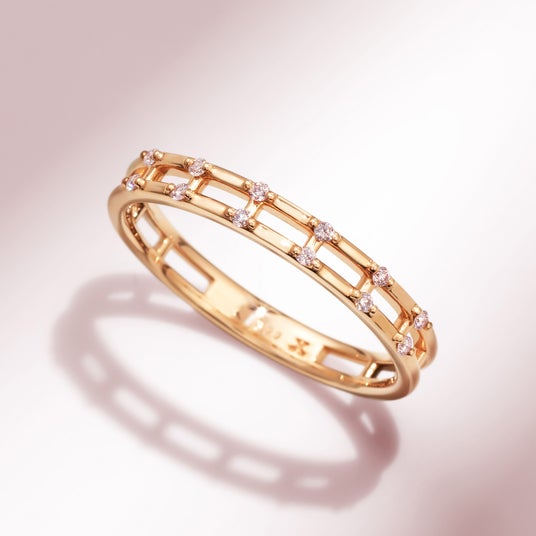 「ピンクダイヤモンド K18リング・エマドットS」は、スタイリッシュな格子状のフォルムの中に、希少石・ピンクダイヤモンドを贅沢に散りばめたデザイン。日常的な使いやすさと上質なジュエリーの要素を兼ね備えたアイテムです。