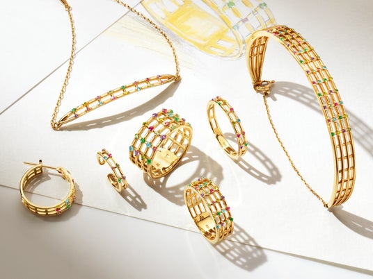 古来から親しまれてきたステンドグラスにインスピレーションを受け、デザインされたコレクション。約5mmの格子状のアームに、7種類の色鮮やかな宝石をスパイスのように散りばめた、繊細なデザインと職人技、宝石の煌めきの三位一体が魅力。光が透ける設計は、存在感がありながら軽やかな印象を与えてくれるアイテムです。