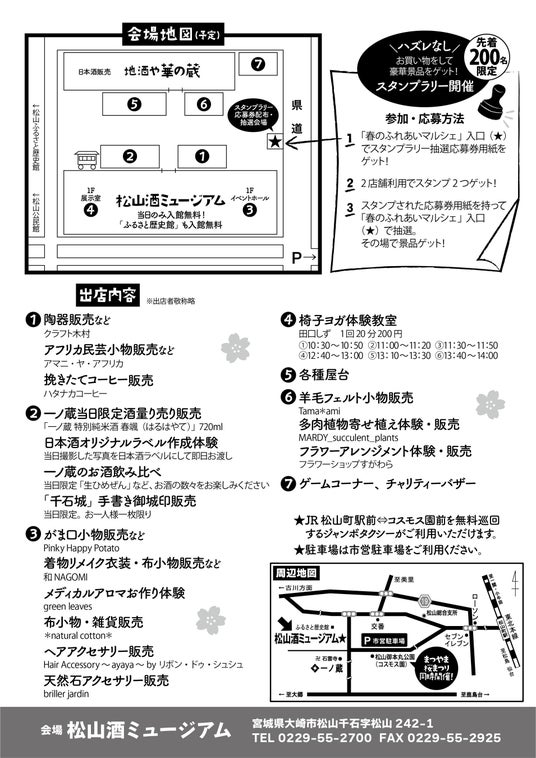 春の生酒の量り売りをはじめ、当日限定のレアなお酒がずらりと並ぶ他、手づくり雑貨販売、クラフト体験、スタンプラリー、椅子ヨガ体験教室など、盛り沢山のイベント。