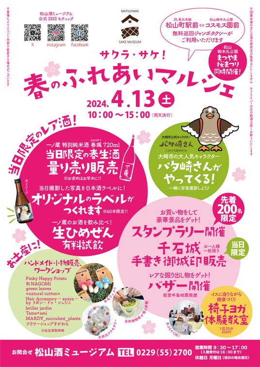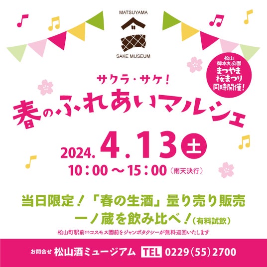 4月13日(土)10:00~15:00、大崎市松山酒ミュージアムにて 『サクラ・サケ!春のふれあいマルシェ』を開催する。 当日限定の特別純米生酒の量り売りや、一般には販売されることのない「生ひめぜん」や一ノ蔵のお酒を飲み比べなど、レアなお酒にお目にかかれるチャンスはこの日だけとなる。