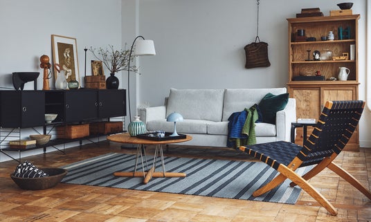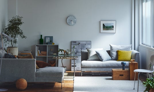 フレキシブルなレイアウトが可能で近年人気のeilersen「RA ソファ」を使い、北欧の名作と和の小物とが混ざりあう「好き」に囲まれた空間を演出