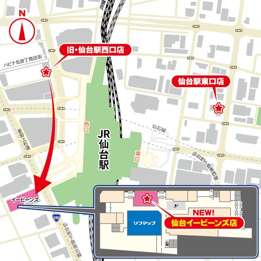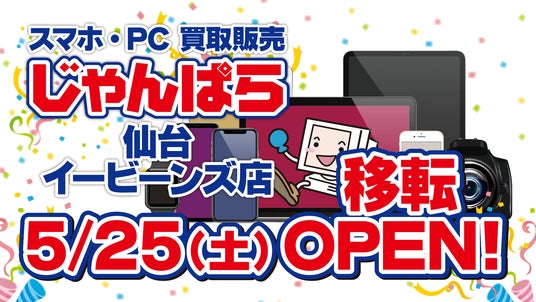 株式会社じゃんぱら(本社:東京都千代田区、代表取締役:小林 直純)が展開するスマホ・パソコンの買取・販売「じゃんぱら」は、「じゃんぱら仙台駅西口店」を移転し「じゃんぱら仙台イービーンズ店」として2024年5月25日(土)にリニューアルオープンします。2021年7月のオープン以来、多くのお客様にご愛顧いただきました「じゃんぱら仙台駅西口店」は、仙台駅前のエンターテイメントの聖地「仙台駅前イービーンズ」の1Fへ移転、「じゃんぱら仙台イービーンズ店」として新たにスタートいたします。