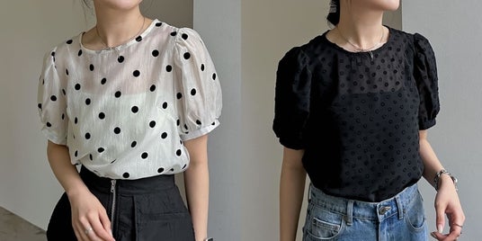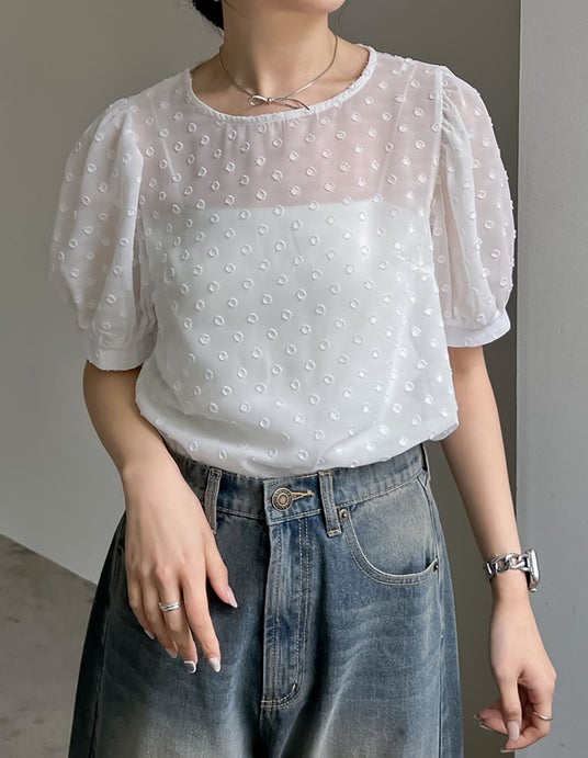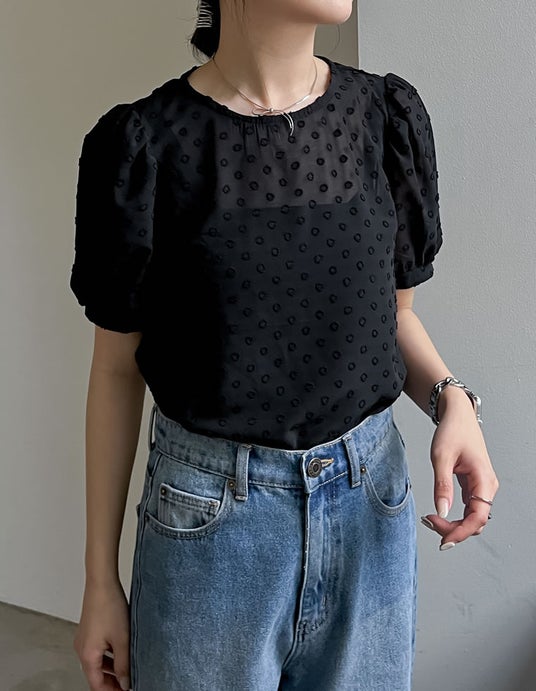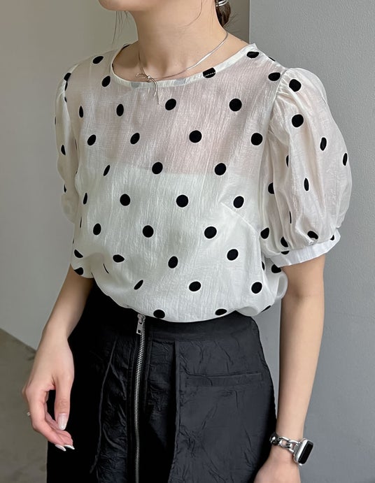 ドラマチックなドット柄で着映える、程よく透け感のあるシアー素材を使用したパフスリーブブラウス。