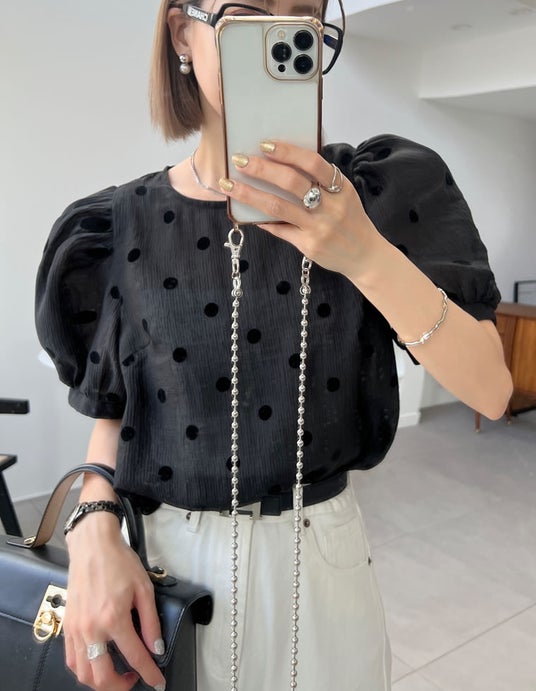 商品名:選べるドット柄パフスリーブシアーブラウス