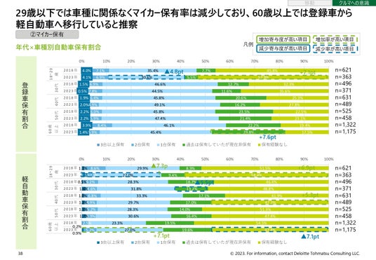 デロイト トーマツ グループの調査によれば※、29歳以下の自動車保有率は登録車、軽自動車を問わず低下し、マイカー非保有者においては、今後も保有しない意向の若年層が増加している。ほかの世代でも保有意向が不透明化していることから、今後の自動車保有率は減少すると考えられる、とされている。