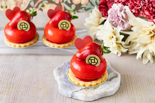 真っ赤な大粒いちごとハートのチョコレートに魅せられる、期間限定のガトーです。ホワイトチョコとミルクで仕上げたなめらかなバニラムースに、いちごソースやいちごクリームの華やかさが絶妙にマッチします。