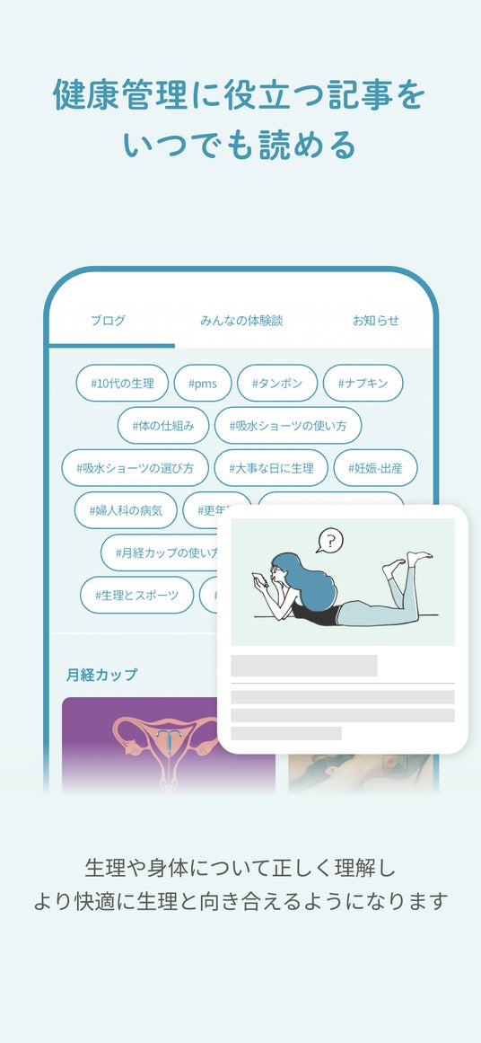 興味のあるテーマからコンテンツを検索して読むことができます。生理や身体について正しく理解し、より快適に生理と向き合えるようになります。