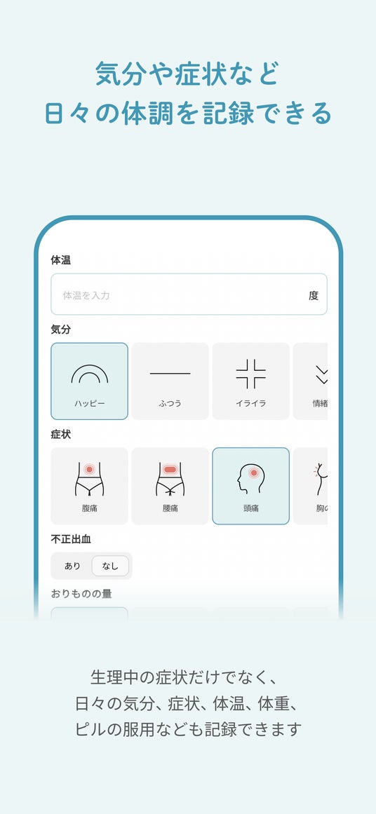 生理痛やイライラなどの生理中の症状だけでなく、日々の気分、症状、体温、体重、ピルの服用なども記録できます。