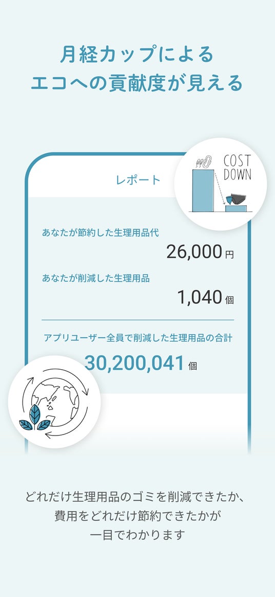 カップを使うことで、生理用品のゴミをどれだけ削減できたか、費用をどれだけ節約できたかが、一目でわかります。