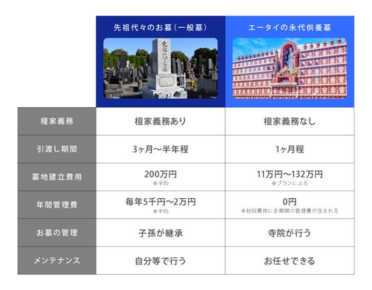 株式会社エータイは、寺院継続と墓継承の社会問題を解決すべく、時代に合わせた永代供養墓とそのあるべき姿(概念)を構築してきました。社会構造の変化により、ライフスタイルや価値観が多様化する現代において、お寺様とお客様を橋渡しするサービスの提供を寺院コンサルティングを通じて実現しています。現在、首都圏を中心に提携寺院数は80ヵ寺以上を数え、通算20,000件以上の永代供養墓の申し込みを承っています。