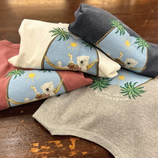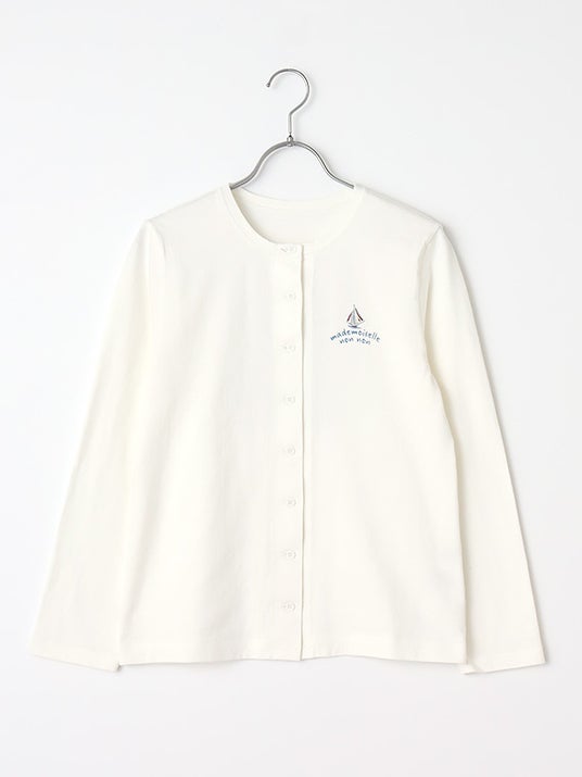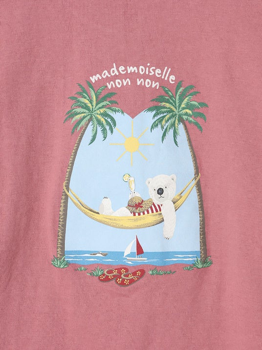 マドモアゼルノンノンからはバカンスを楽しむシロクマをプリントしたカーディガン。吊り編み機でゆっくりと時間をかけて編み上げられた天竺生地を使った薄手の柔らかなカーディガンは、春夏の羽織りとして活躍してくれる一着。