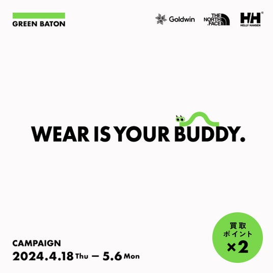 株式会社ゴールドウイン(本社:東京都渋谷区、代表取締役社長:渡辺貴生)が2022年7月から始動した、アパレルの廃棄を減らし、ファッションロス・ゼロを目指すためのリセール事業であるサステナブル・レーベル「GREEN BATON(グリーン・バトン)」(※)は、ブランドムービー『MY WEAR(マイウエア)』の公開を記念して、『WEAR IS YOUR BUDDY(ウエア・イズ・ユア・バディ)』キャンペーンを4月18日(木)から5月6日(月)までの期間限定で実施します。
