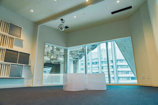 通路に面したスタジオ外壁には、デジタルサイネージを採用しています。同時に5つの映像が投影でき、スタジオ内の様子をカメラを通じで外部に放映することができます。