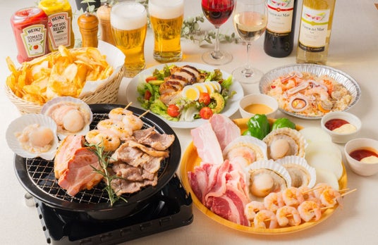 生ハムシーザーサラダ/トリュフ風味ポテトフライ/シーフードペペロンチーノ/BBQプレート(牛肩ロース・骨付きソーセージ・殻付きホタテ・イカ焼き・エビ串・玉ねぎ・ピーマン)