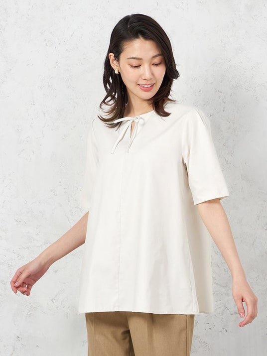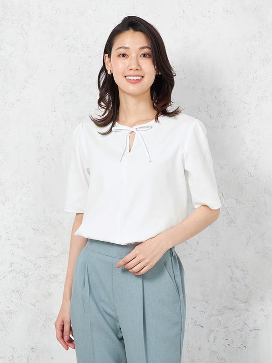 このたび新たに発売する新作ブラウスはあたたかくなってくる春夏シーズンに向けたブラウスが発売開始いたします。涼しく着られる遮熱機能や、透けにくい素材を採用し夏場の着用で気になるインナー透けにも対応、UVカット機能も搭載で日差し対策まで叶う夏場に嬉しいポイントを詰め込んだブラウスです。スーツスタイルのジャケットインとしてもちろんのこと、フロントにアクセントをつけたデザインのため、一枚での着用でオフィスカジュアルスタイリングもお楽しみいただけます。また、着丈と袖丈を長めにすることでボディラインを拾わないパターンがスタイルをカバーしてくれるブラウスに仕上げています。