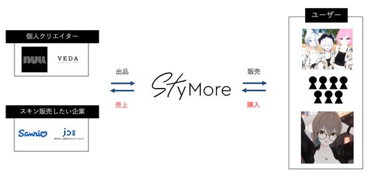 個人のクリエイターや事業会社のメタバースアイテムをStyMore(スタイモア―)に出品いただき、ユーザーはStyMore(スタイモア―)に出品されたデジタルアイテムを購入。購入代金のうち、個人クリエイター7%、企業10%の手数料(※)を引いた金額が出店者の売上として受け取りいただけるビジネスモデルです。