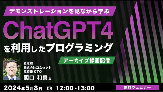 株式会社クリーク・アンド・リバー社(C&R社)は5月8日(水)、昨年8月に開催したオンラインセミナー「デモンストレーションを見ながら学ぶ ChatGPT4を利用したプログラミング」のアーカイブ映像を無料配信します。なお、本セミナーは、ChatGPTや近年のAI技術の活用にご興味をお持ちの方々を対象とした内容で、当日は12:00~の1回配信予定です。