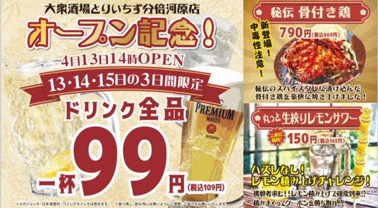 24年4月13日(土)大衆居酒屋とりいちず分倍河原店新規オープン。オープン記念として13日(土)、14日(日)、15日(月)の3日間限定!何杯飲んでもドリンク1杯99円(税込109円)セール開催!