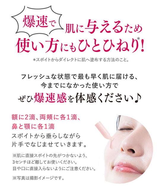 スポイトから顔へ直接垂らすと、フレッシュな状態で爆速で肌へ届けられます。