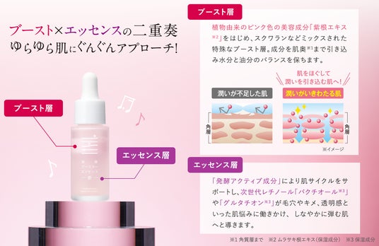 「発酵ブースターエッセンス 奏」はブースト層とエッセンス層の2層設計で、オイル層よりも馴染みが良く、肌への浸透感が高まります。また、2層式にすることで油分と水分が混ざりあい肌が柔らかくほぐれ、化粧水の入りもよくなります。