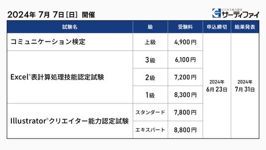 株式会社サーティファイ(本社:東京都中央区、代表取締役:瀧澤茂、以下「サーティファイ」)は、2024年7月7日(日)に開催する「コミュニケーション検定」「Excel(R)表計算処理技能認定試験」「Illustrator(R)クリエイター能力認定試験」の公開試験の申込受付を2024年4月9日より開始しました。